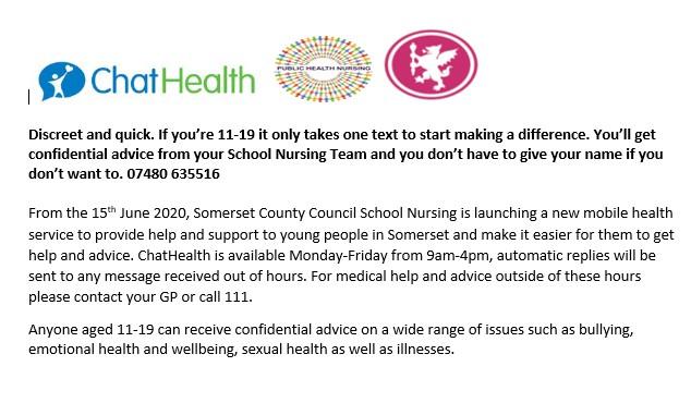 From the 15th June 2020, Somerset County Council School Nursing is launching a new mobile health service to provide help and support to parents and carers in Somerset and make it easier for them to get help and advice. ChatHealth is available Monday-Friday from 9am-4pm, automatic replies will be sent to any message received out of hours. For medical help and advice outside of these hours please contact your GP or call 111.